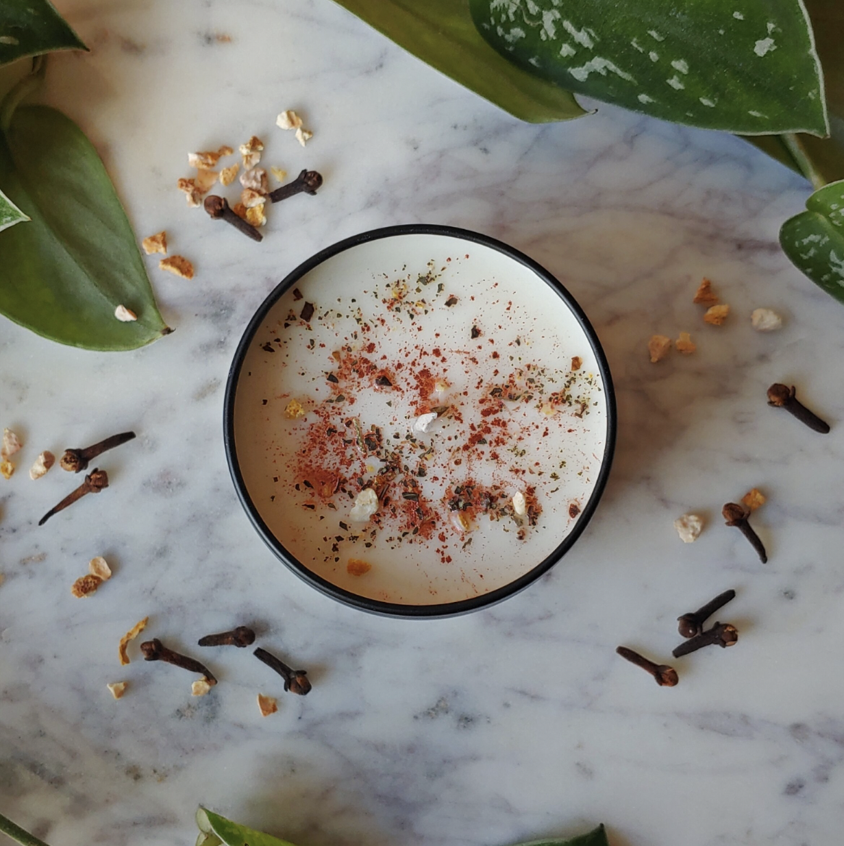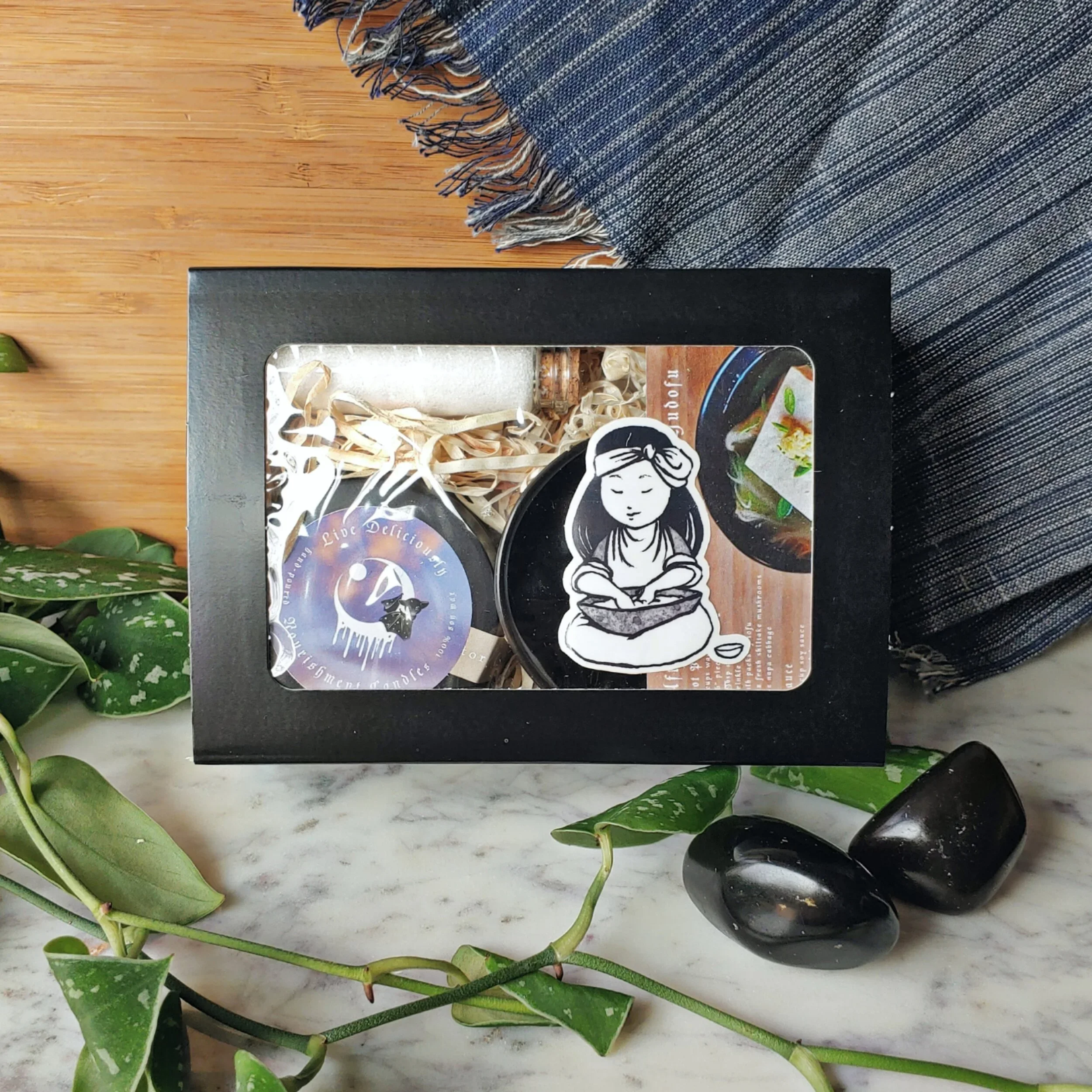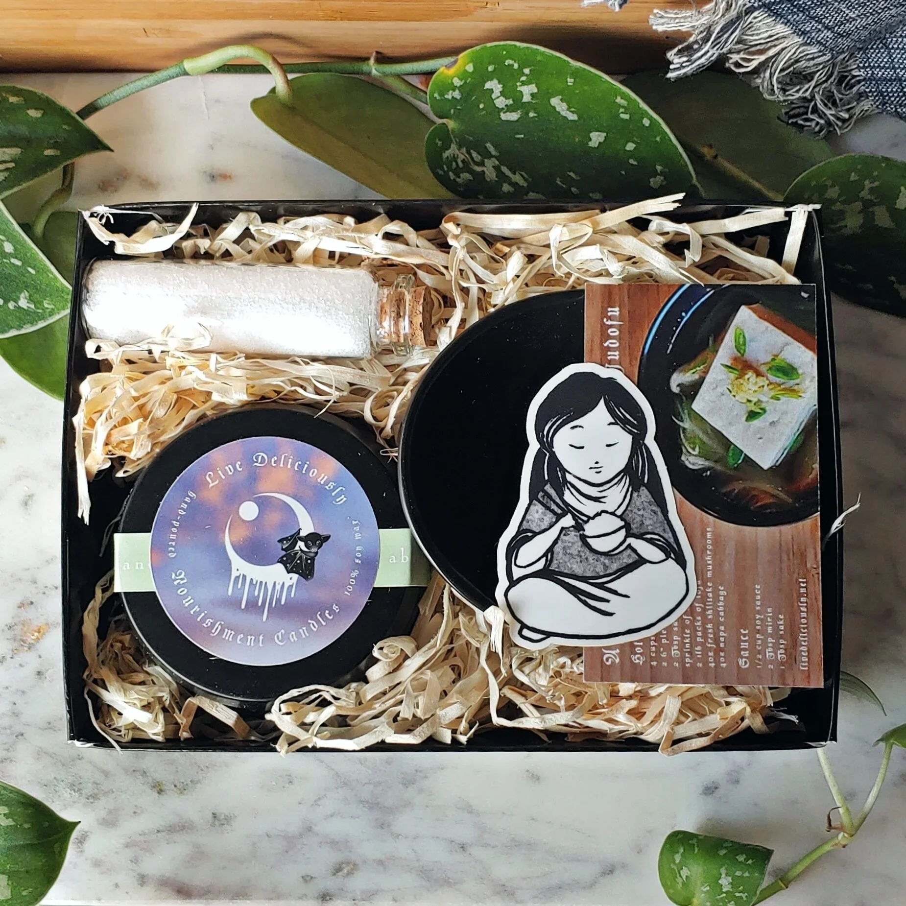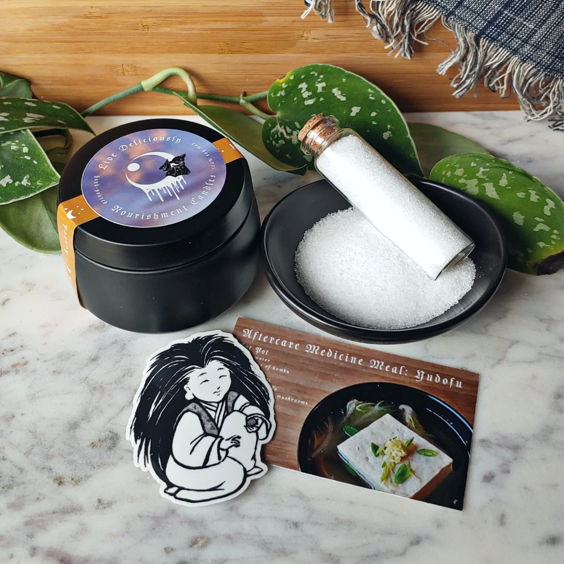 This ritual kit was crafted to help one draw in energies that will bring them nourishment. The kit was personally customizable to one’s own path and intuition. Each kit came with the choice of Live Deliciously Nourishment Candle and Wisdom Keeper Sticker, salt (for purification or offering), a bowl, a vegan Aftercare Medicine Meal recipe of yudofu and suggested ritual instructions. Each Live Deliciously Nourishment Candle was 100% soy wax and dressed with a hand-ground herbal blend.